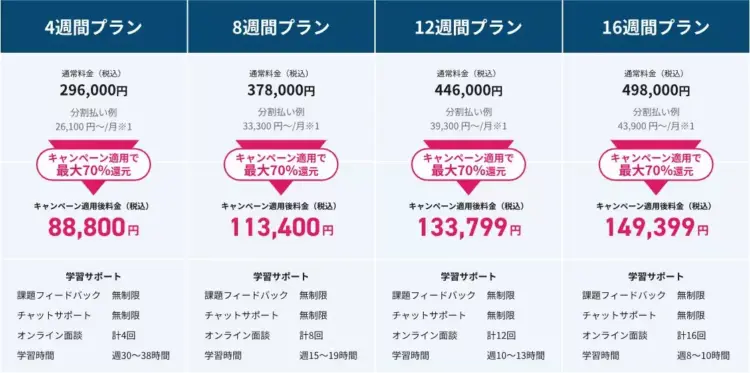 さらに、4〜16週間と複数のプランが用意されているため、「短期間で集中して学びたい人」「ゆっくり確実に理解したい人」どちらにも対応できます。