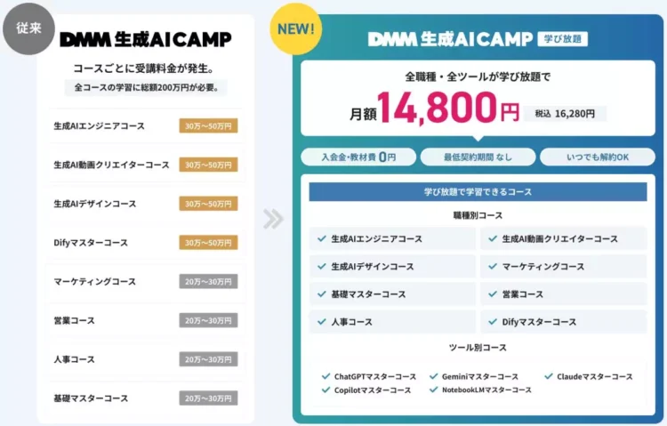 DMM 生成AI CAMPは、月額14,800円のサブスク型のスクールです。