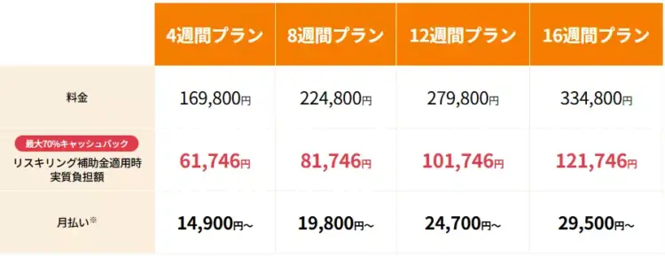 どのコースも、受講期間は4週間・8週間・12週間・16週間のプランが用意されていて、公式には「どの学習期間でも学習カリキュラムの内容は同じ」と案内されています。